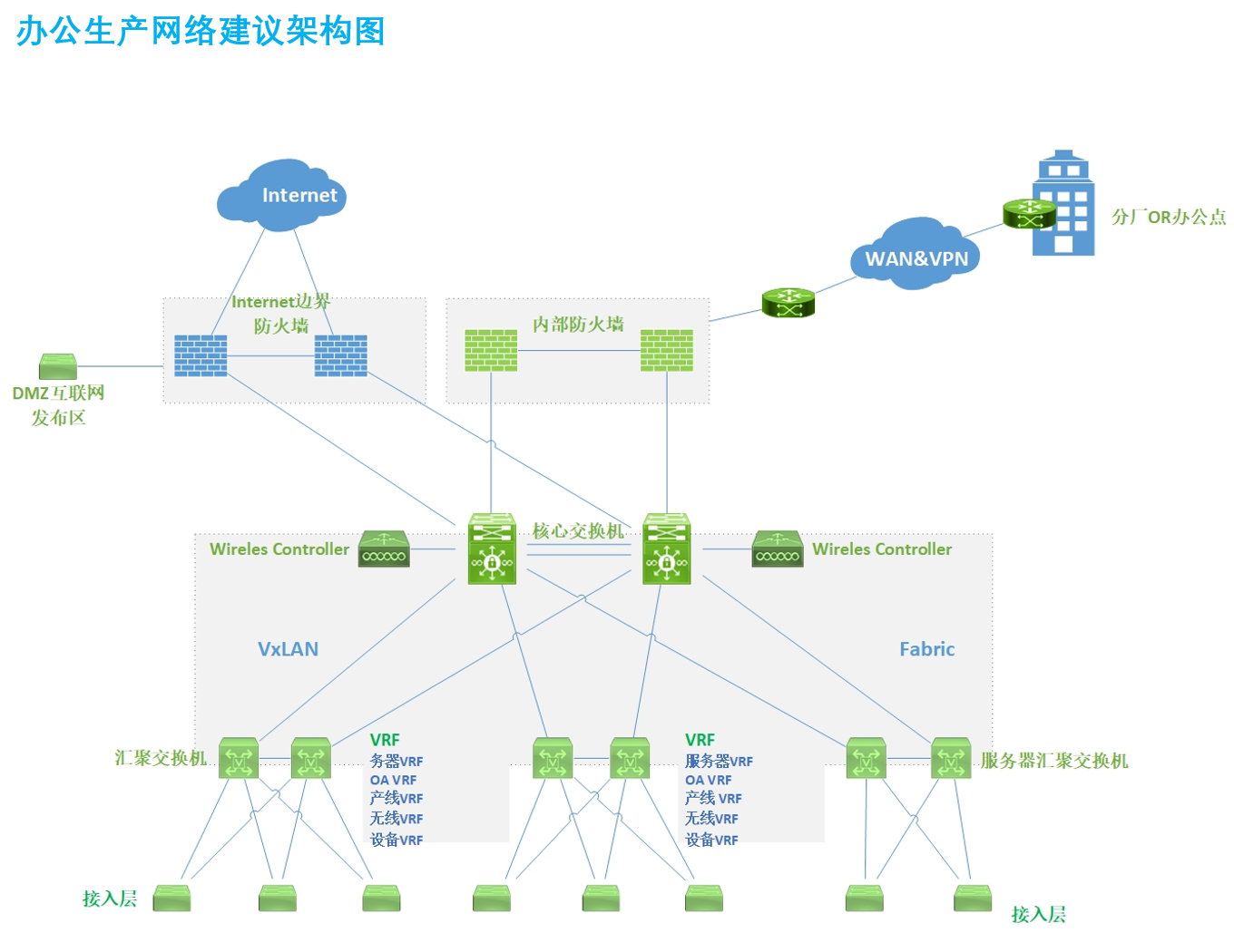 3、终端的网关将下沉到汇聚层。可根据不同的用户或者设备群体划分不同的VRF或者VN。每个VRF可以包含多个VLAN。